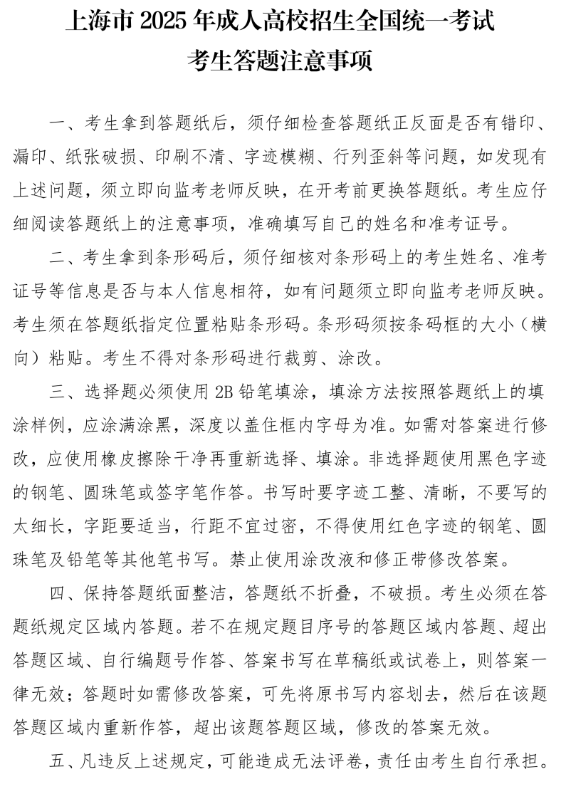 1.请考生本人自行下载打印本次考试准考证。准考证下载网址:https://czbm.shmeea.edu.cn/。下载打印时间:2025年10月11日-10月17日(每天9:00-22:00),10月18日-10月19日(每天7:00-22:00)。考生务必仔细看清准考证上的考试时间、地点和备注等信息,关注考试当天交通及天气情况,合理安排出行时间及路线,提前60分钟到达考点。