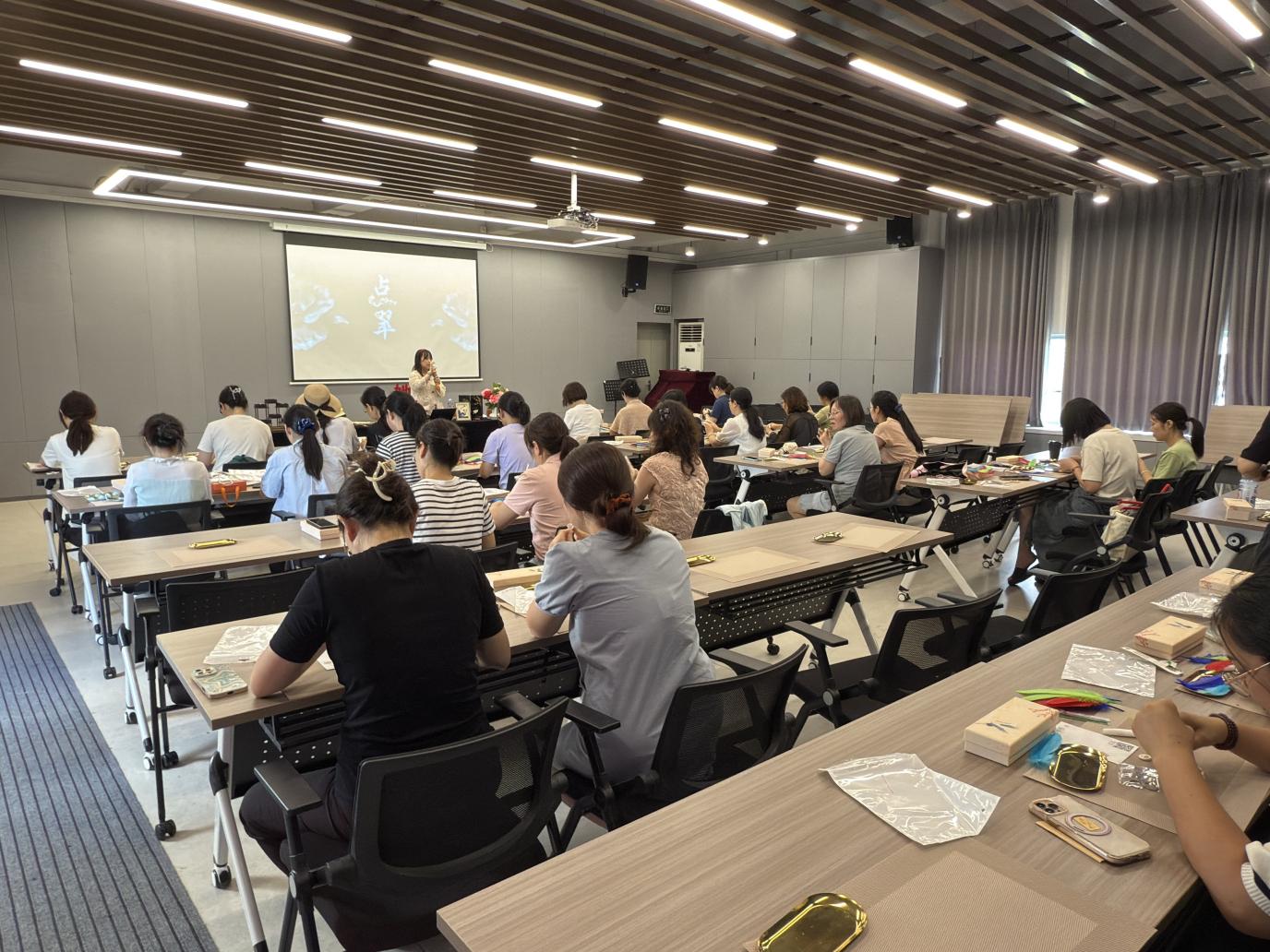 2025 年 9 月 26 日下午,松江校区乐群楼 302 活动室内翠色流转、匠心涌动,“她课堂” 仿点翠发簪制作活动在此顺利举办。40余名女教师以羽为材、以手为媒,在金属与羽毛的交织中触摸非遗温度,于传统与现代的碰撞中传承东方美学。