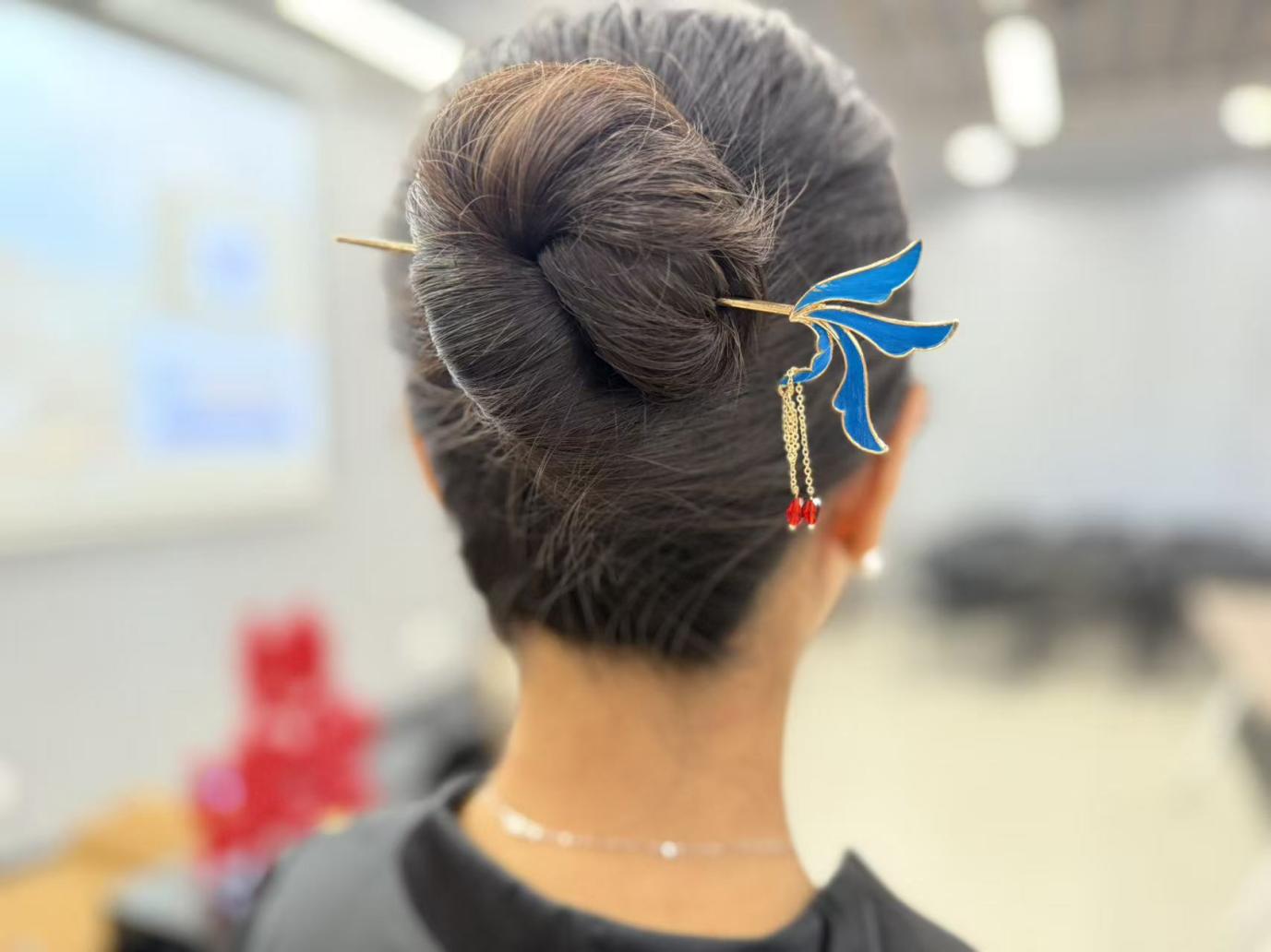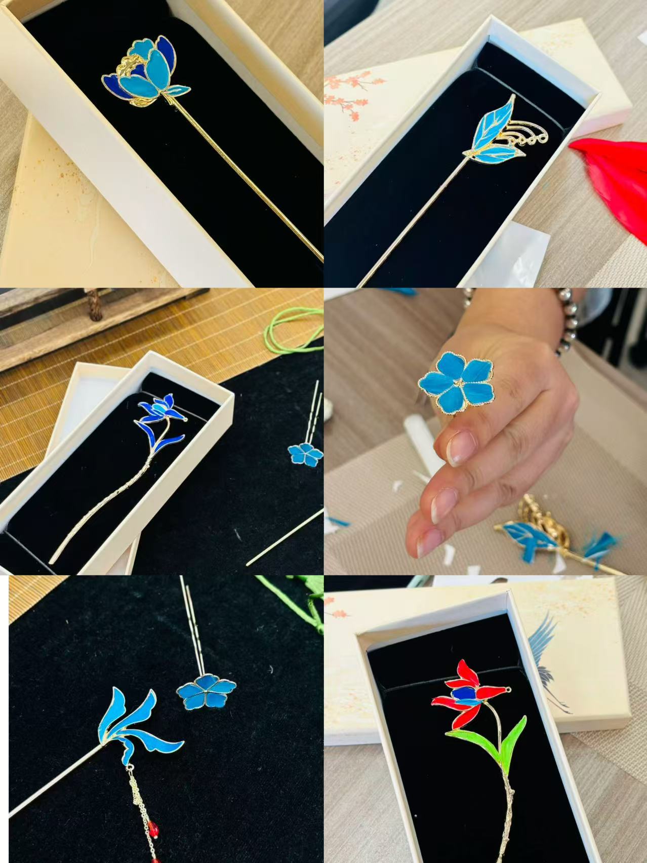活动伊始,非遗导师的讲解为参与者打开了仿点翠工艺的历史长卷。点翠兴起于春秋战国、鼎盛于明清,曾是宫廷专为皇室打造首饰的核心技法。古人以翠鸟羽为材,现代仿点翠以染色鹅毛等环保材料替代翠羽,既保留了 “皎月藏蓝、湖光映翠” 的灵动色泽,更实现了工艺传承与生态保护的双赢。