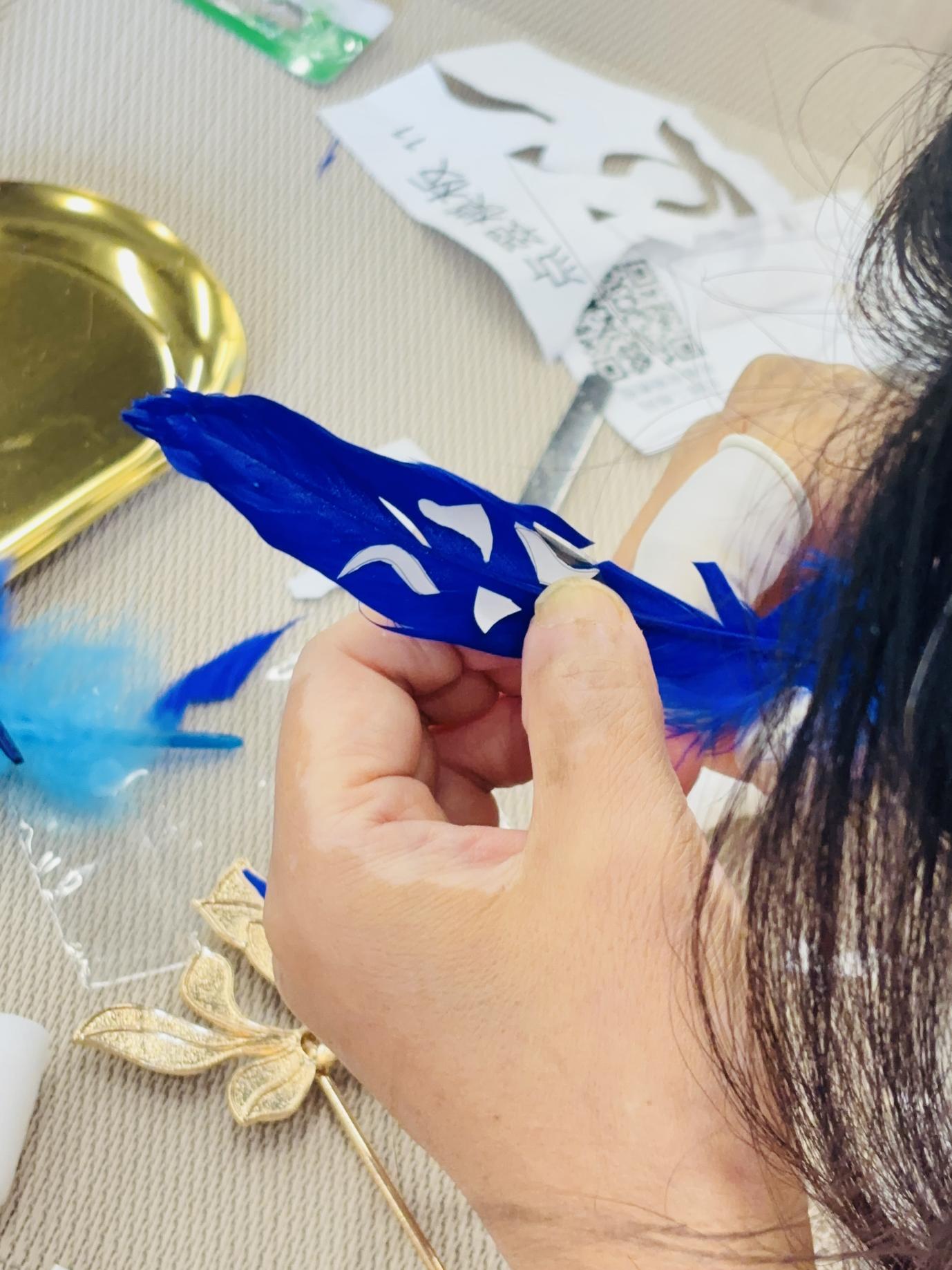 在实践环节,参与者们化身 “非遗传承人”,专注投入每一道工序。先用细砂纸打磨金属底座边缘,再根据纹样裁剪染色鹅毛,随后以特制胶水小心粘贴。看似简单的粘贴,实则要讲究疏密均匀,指尖的细微颤动中藏着对精度的追求。金属的冷硬与羽毛的柔润在指尖交融,原本素净的底座渐渐绽放出幽蓝光泽。