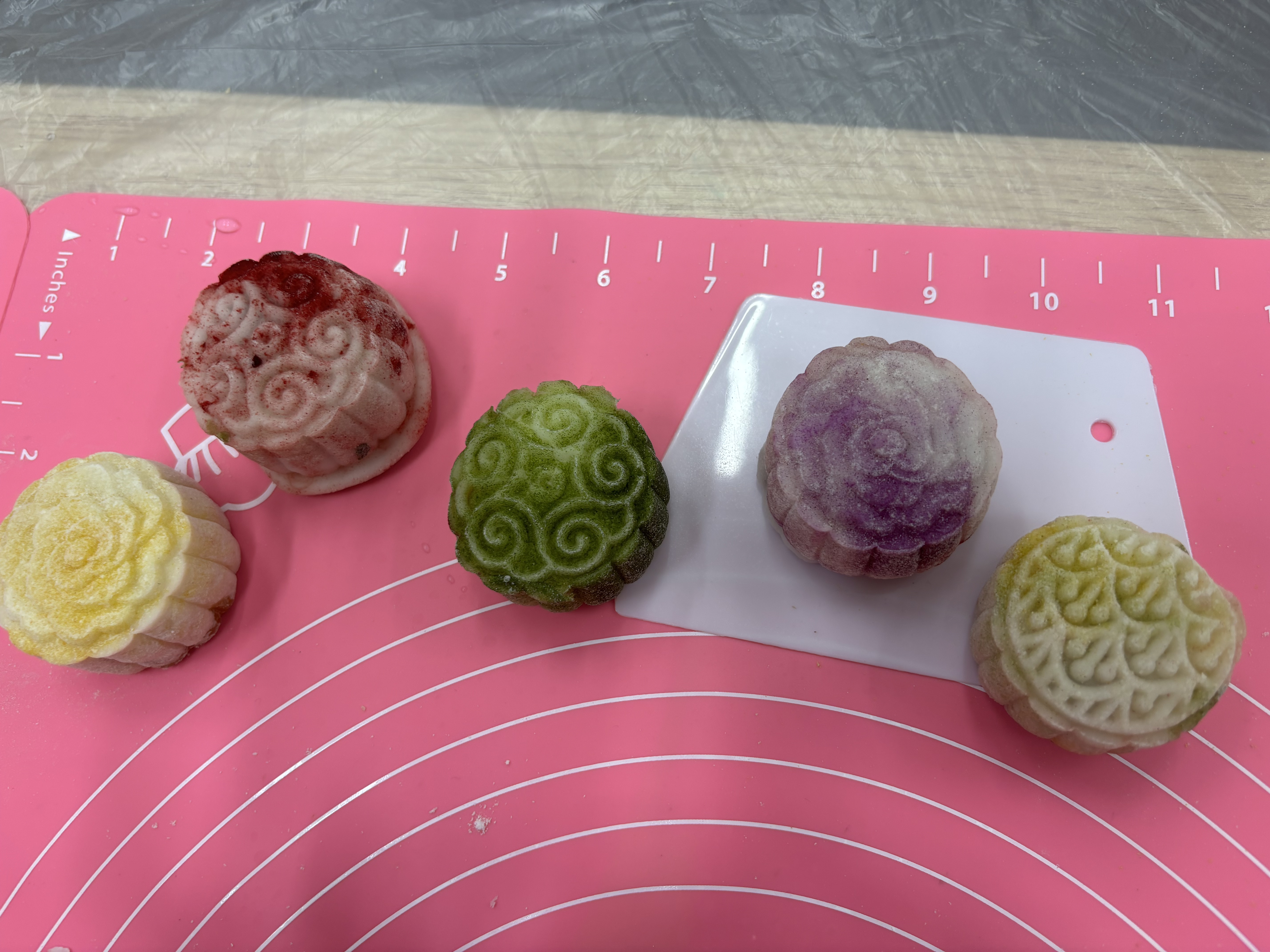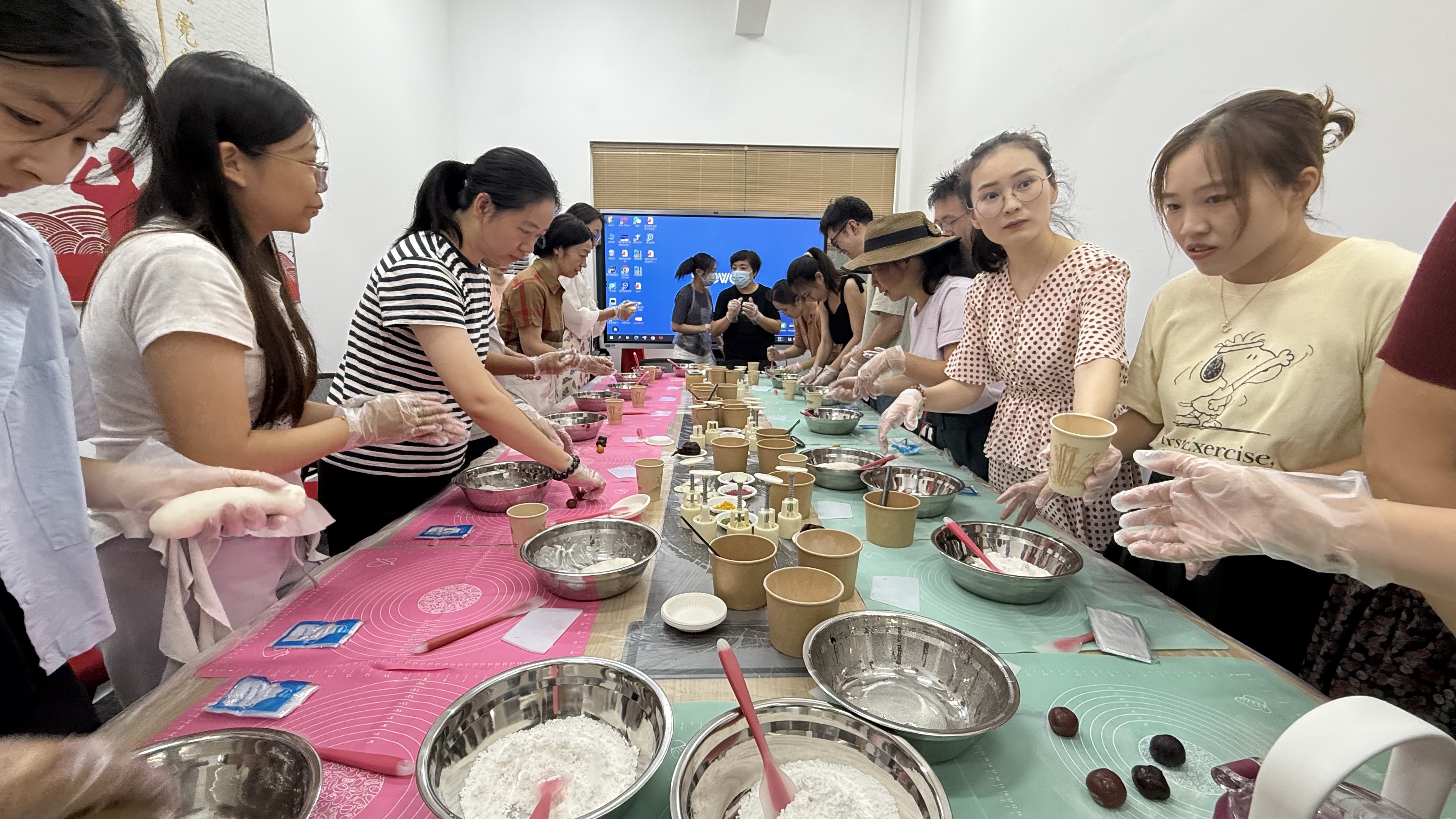 活动现场气氛热烈,老师们在专业师傅的指导下,亲手制作冰皮月饼。从和面、包馅到压模成型,大家兴致盎然,互相交流制作心得,现场欢声笑语不断。一个个精致可口的月饼不仅传递了节日的甜蜜,也凝聚了同事之间的协作与情谊。