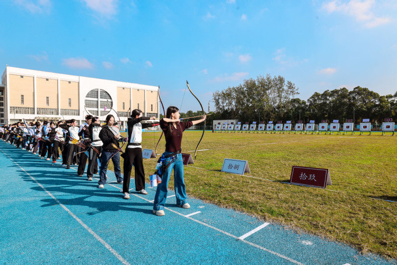 随后,郭蓓宣布本次赛事开幕。正式比赛前,学校精心安排了双轮平衡车、轮滑与跑射等表演项目,实现传统射艺与现代运动的有机融合,充分展现了我校体育文化的创新活力与时代气息。