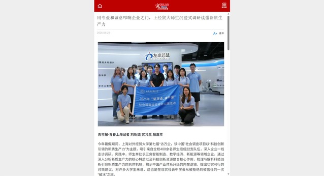 今年暑假期间,上海对外经贸大学第七届“访万企,读中国”社会调查项目以“科技创新引领的新质生产力”为主题,吸引来自全校400余名师生组成22支队伍,深入企业一线走访调研。实践中,师生奔赴长三角智能制造、数字经济、新能源等领域企业,通过深入分析新质生产力的核心特质以及科技创新资源整合核心作用,梳理与解析科技创新引领新质生产力的具体机制,揭示中国产业体系升级的内在逻辑,提出切实可行的对策建议。对许多大学生来说,这也是在现实社会中学会从被拒绝到被信任的一次“破冰”之旅。