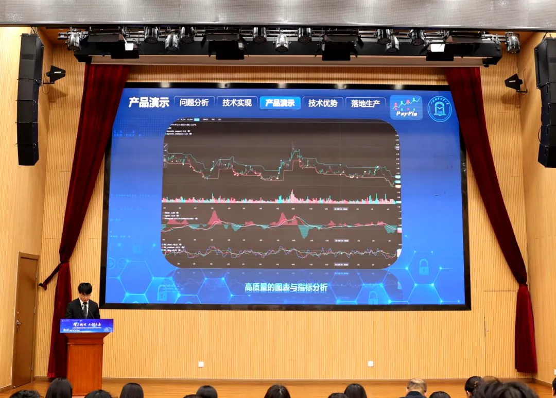 获奖学生代表周禹璇、匡思炀分别展示获奖作品《宏微观双视角下中国新制生产率与社会变革的时空共振》《PsyFin深融智策》。