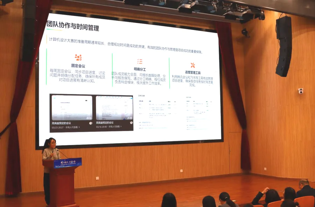 中国计算机设计大赛优秀指导教师李莉作为教师代表进行发言,鼓励同学们要勇于创新和尝试、脚踏实地,在竞赛中提升自身能力。