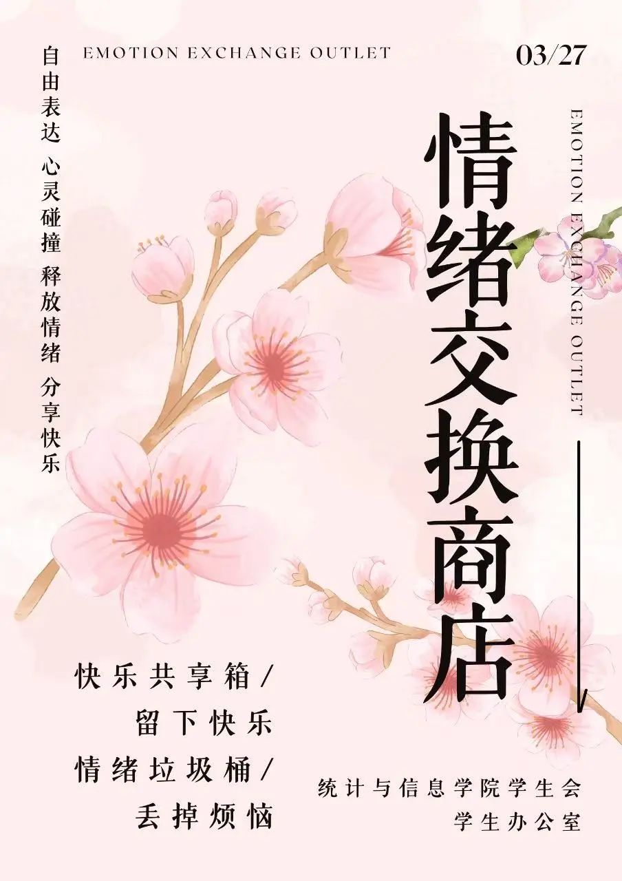 3月27日,在校、院学生会(研究生会)举办的“我为同学做实事”专场服务——“心灵驿站,温暖同行”中,统计与信息学院学生会开展了“情绪交换商店”的服务摊位,旨在助力同学们于喧嚣之中寻得内心的宁静港湾,让疲惫的心灵得以栖息,重新汲取前行的力量。