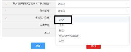 3、如实填写信息,转入原因选择升学,申请转入组织在第一栏中选择【团上海市委】,第二栏中选择【上海对外经贸大学团委】,第三栏中选择【统计与数据科学学院】