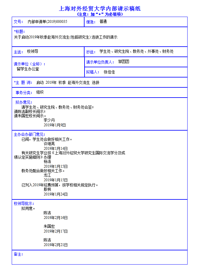 2019年秋季赴海外交流学生选拔工作即将展开,经前期请示学校,内请文件《关于启动2019年秋季赴海外交流生(包括研究生)选拔工作的请示》附件1,学校批示详见附件2,现根据相求启动选拔工作,请各学院要求认真组织学生申报和选拔工作。