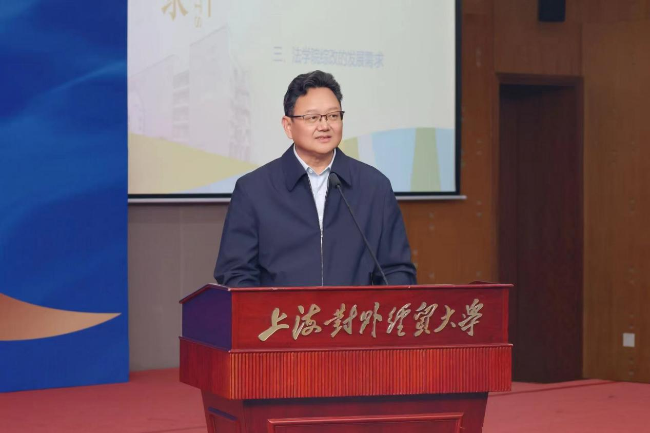 副校长姜秀珍出席并致辞,法学院领导班子全体成员、系主任、教工支部书记、教师代表和学生代表近百人参加会议。致辞环节由法学院党委副书记商志民主持。