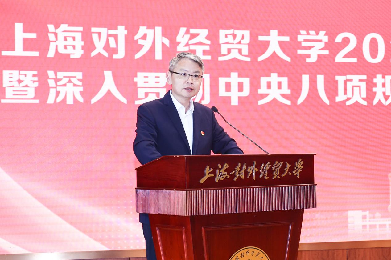 6月3日下午,学校举行2025年党员基本培训第二次集中大课暨深入贯彻中央八项规定精神学习教育专题辅导报告会,中央党校(国家行政学院)党的建设教研部副主任祝灵君教授作“学习贯彻习近平总书记关于加强党的作风建设的重要论述和中央八项规定精神”视频报告。学校全体师生党员在图文信息楼507报告厅主会场和松江、长宁9个分会场听取报告。校党委书记祁明主持并讲话。
