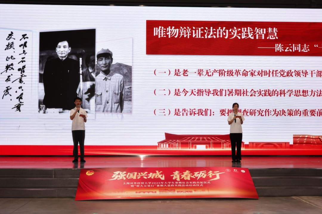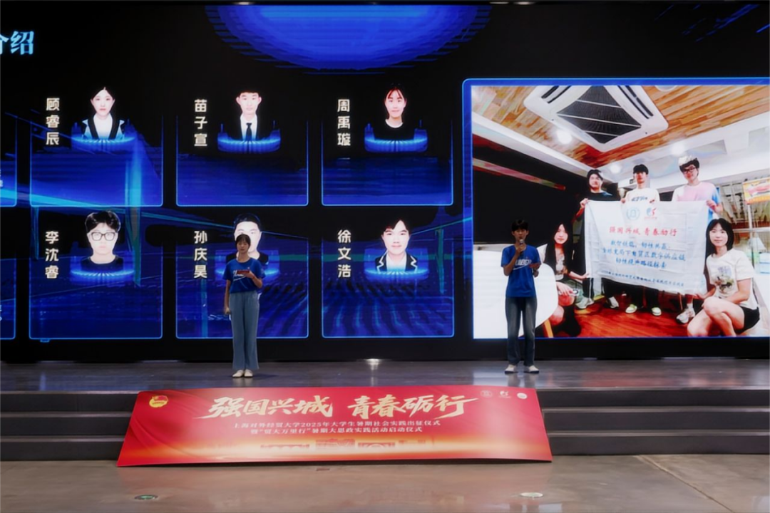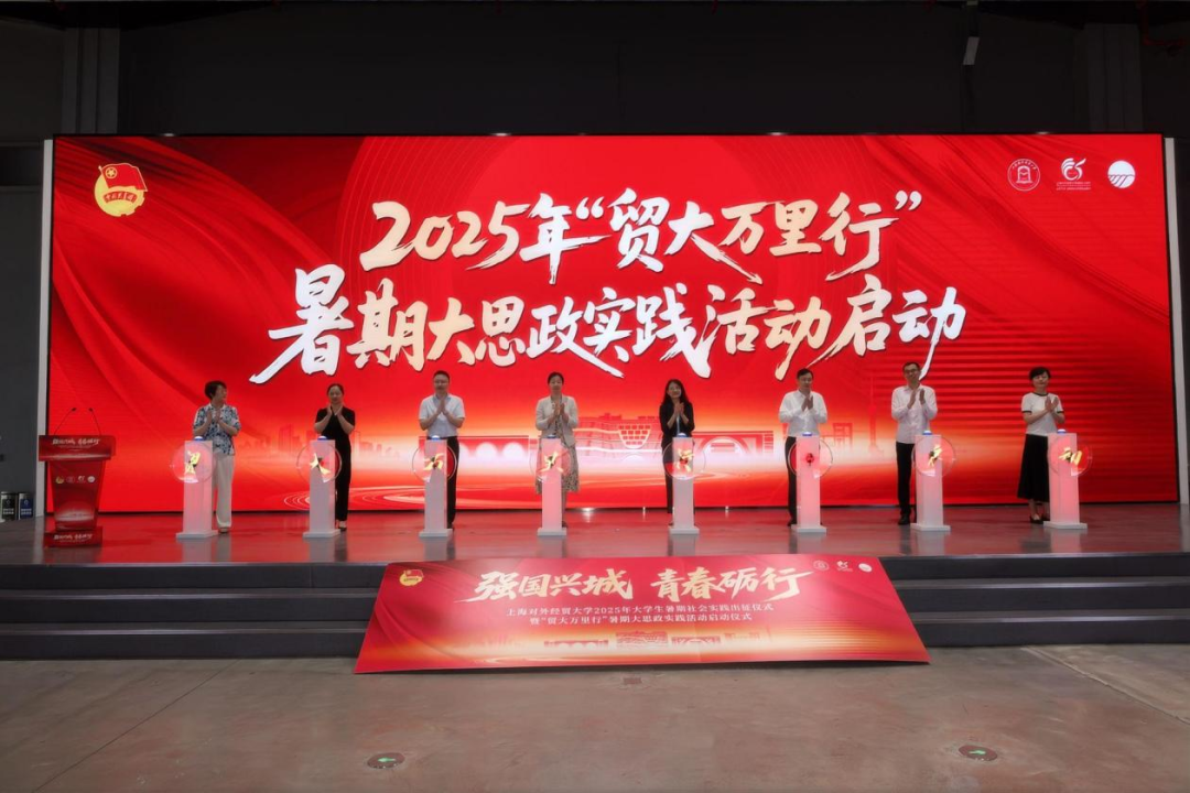 6月27日,上海对外经贸大学“强国兴城,青春砺行”2025年大学生暑期社会实践出征仪式暨“贸大万里行”暑期大思政实践活动启动仪式在虹桥品汇举行。校党委副书记、副校长沈艺,东方国际(集团)有限公司党委副书记薛继凤,团市委学校工作部部长葛银锋,虹桥品汇总经理蔡军,相关部门和各二级学院党组织、团组织负责人,实践团队师生代表等参加活动。会议由校团委书记司徒力云主持。