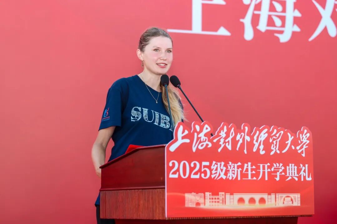 工商管理学院波兰籍留学生古梦洁同学代表留学生新生发言,她分享了因热爱中国文化来华深造的心路历程,称“SUIBE就是我们在上海的家”。中国电商平台、电子支付的快速发展激发了她学习市场营销专业的浓厚兴趣,也使她立志用语言和专业优势为中波商业和文化交流贡献力量。
