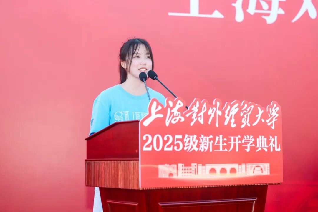 国际经贸学院徐培文同学代表本科生新生发言,她讲述了自己选择国际经济与贸易——数据科学与大数据技术双学士学位专业的初心,从学校校训出发,分享了对诚信立身、宽容待人、博学筑基、务实成事的深刻理解,号召同学们成长为有理想、敢担当、能吃苦、肯奋斗的新时代好青年。