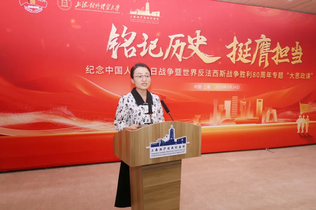 9月24日,上海对外经贸大学与上海淞沪抗战纪念馆围绕“铭记历史,挺膺担当”主题,联合举办纪念中国人民抗日战争暨世界反法西斯战争胜利80周年专题“大思政课”,把红色资源融入思政育人实践,大中小学生同上一堂生动的思政课。上海对外经贸大学党委副书记、副校长沈艺,宝山区委宣传部副部长、区委网信办主任刘德龙,上经贸大党委常委、宣传部长郭茜,宝山区文化和旅游局副局长姜芬芬,上海淞沪抗战纪念馆馆长孔祥俊,上经贸大马克思主义学院党委书记刘海泉、党委副书记张帅出席活动,上海对外经贸大学及其附属松江实验教育集团的师生代表共同参与,在历史现场接受深刻的精神洗礼。