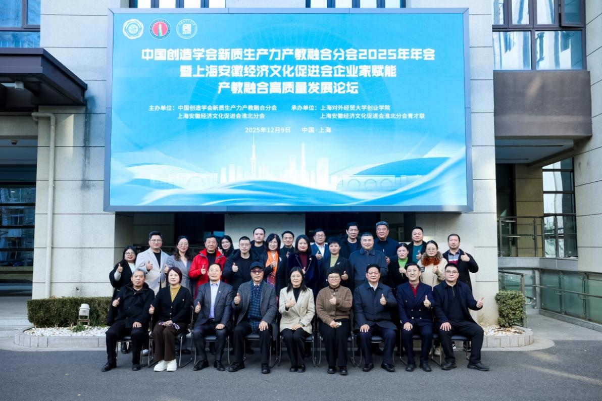 12月9日下午,中国创造学会新质生产力产教融合分会2025年年会暨上海安徽经济文化促进会企业家赋能产教融合高质量发展论坛在上海对外经贸大学长宁校区成功举办。中国创造学会新质生产力产教融合分会主任委员、上海对外经贸大学副校长姜秀珍教授,上海市学生事务中心创新创业部部长姚栋华,东华大学旭日工商管理学院二级教授、中国创意城市研究院院长高长春,上海对外经贸大学学术期刊社社长高运胜教授,上海安徽经济文化促进会执行会长、上海电能集团董事长吴献忠,上海安徽经济文化促进会常务副会长、北京炜衡(上海)律师事务所监委会主任、高级合伙人马永健律师,中国创造学会新质生产力产教融合分会常务副主任委员兼秘书长、上海对外经贸大学创业学院副院长高伟,以及来自中国创造学会新质生产力产教融合分会、上海安徽经济文化促进会的多位专家代表和学生近200人参加了本次活动。