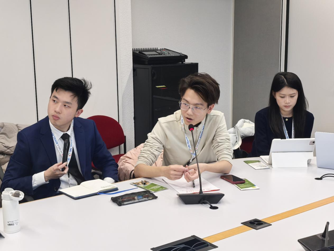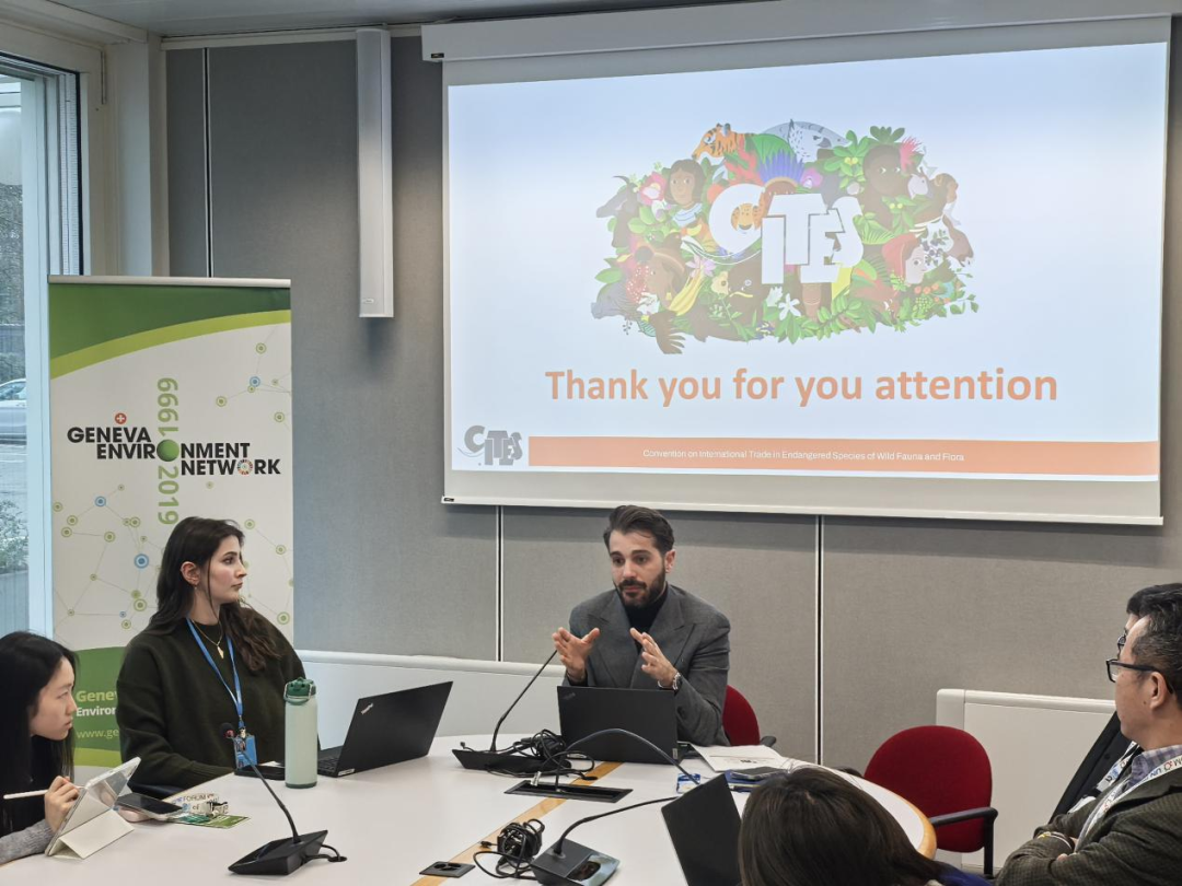 研学团第一站走进联合国环境规划署日内瓦环境网络(UNEPGEN)。UNEPGEN《濒危野生动植物种国际贸易公约》(CITES)项目管理主任StavrosAntoniadis介绍了物种监管体系与非法野生物贸易国际协同举措,绿色产业平台负责人HannesMac Nulty分享了绿色经济发展痛点及AI工具赋能实践,实习生YasmeenAwad解读了日内瓦环境治理枢纽建设、UNEPGEN的核心职能,以及全球危机治理框架。师生们围绕净零目标下的技术革新、野生物贸易与自由化平衡等内容与国际组织官员交流,深化对全球环境治理的认知。