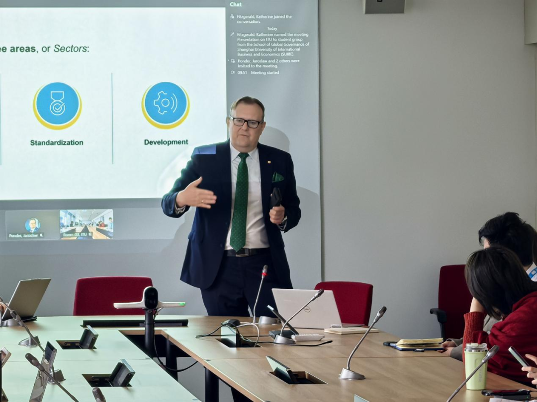 研学团在国际电信联盟(ITU)参访时,ITU欧洲办事处主任JaroslawPonder介绍了ITU发展历程与核心工作。他回顾了ITU自电报、无线电时代至互联网、人工智能时代的发展历程,详细阐释了ITU三大核心部门职能,以及ITU以194个成员国平等参与为基础的共识导向决策机制,与私营部门紧密合作、吸纳非传统利益相关者的合作模式。