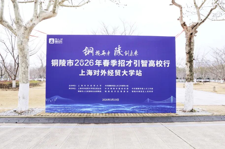 3月19日,上海对外经贸大学与铜陵市合作举办“铜揽英才,陵创未来”2026年春季招才引智高校行宣讲会、校园招聘会等主题活动。上海对外经贸大学党委书记祁明,党委副书记、副校长沈艺,铜陵市委常委、组织部部长郑刚,铜陵市委组织部副部长、市委人才工作局局长彭文雅,铜陵市委组织部副部长、市人社局局长都斌等铜陵市相关领导,学校办公室、招生就业处相关负责人及100余名师生代表出席此次活动。宣讲活动由彭文雅主持。