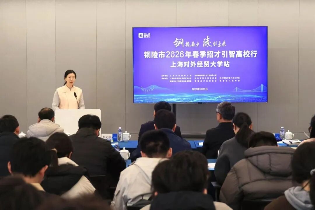 沈艺代表学校对铜陵市代表团的到来表示热烈欢迎,对铜陵市长期以来为我校毕业生提供优质就业岗位、搭建发展平台表示感谢。她指出,上海对外经贸大学作为长三角地区聚焦对外经贸领域的特色型高校,始终致力于培养高素质的对外经贸人才,与铜陵市有着深厚的合作基础和广阔的合作空间。双方签署战略合作协议以来,校地互动频繁、合作成效显著。此次活动再次为校地人才合作注入新活力,学校愿与铜陵从人才培养、产学研融合、长效机制建设三方面持续深化合作,共育英才。她勉励学子了解铜陵、选择铜陵,将青春理想融入城市发展,在实干中实现人生价值。