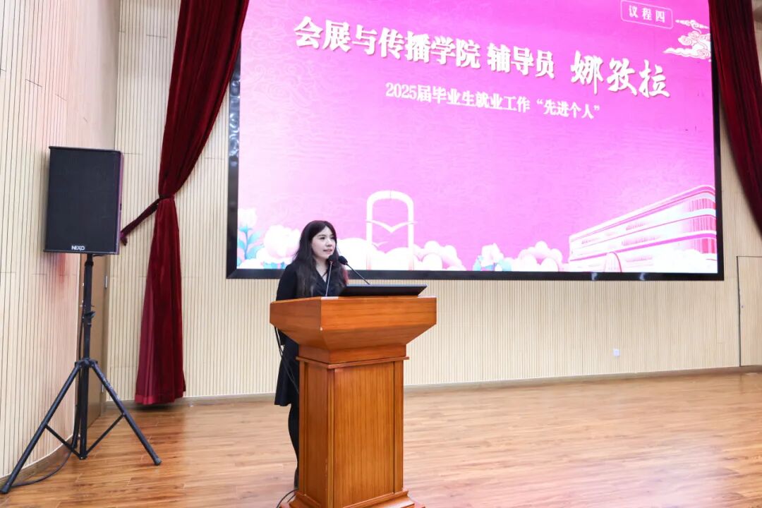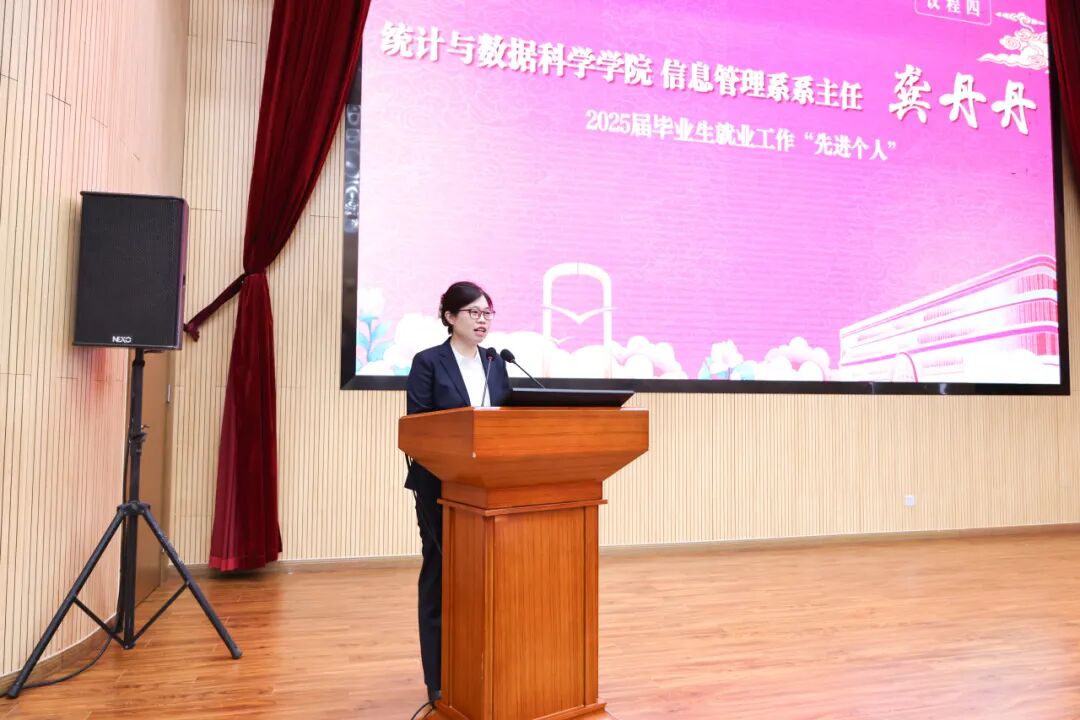 2025年本科招生工作“先进集体”、毕业生就业工作“先进集体”获奖代表国际经贸学院党委书记张嵘,毕业生就业工作“先进集体”获奖代表法学院党委书记乔檀,毕业生就业工作“先进个人”获奖代表统计与数据科学学院信息管理系系主任龚丹丹,毕业生就业工作“先进个人”获奖代表会展与传播学院辅导员那孜拉作交流发言。