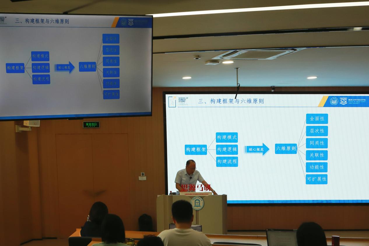 随后,郑春荣教授结合同济大学区域国别学知识图谱的建设实践,分享了具体的构建理念与方法论。他重点介绍了基于全面性、层次性、同类性、关联性、功能性、可扩展性六维原则的构建框架,并强调了“自上而下”进行顶层设计的重要性。他指出,知识图谱的构建绝不能是对现有课程的简单数字化翻版,而必须从区域国别学的人才培养目标和学科内核出发,进行体系化设计。
