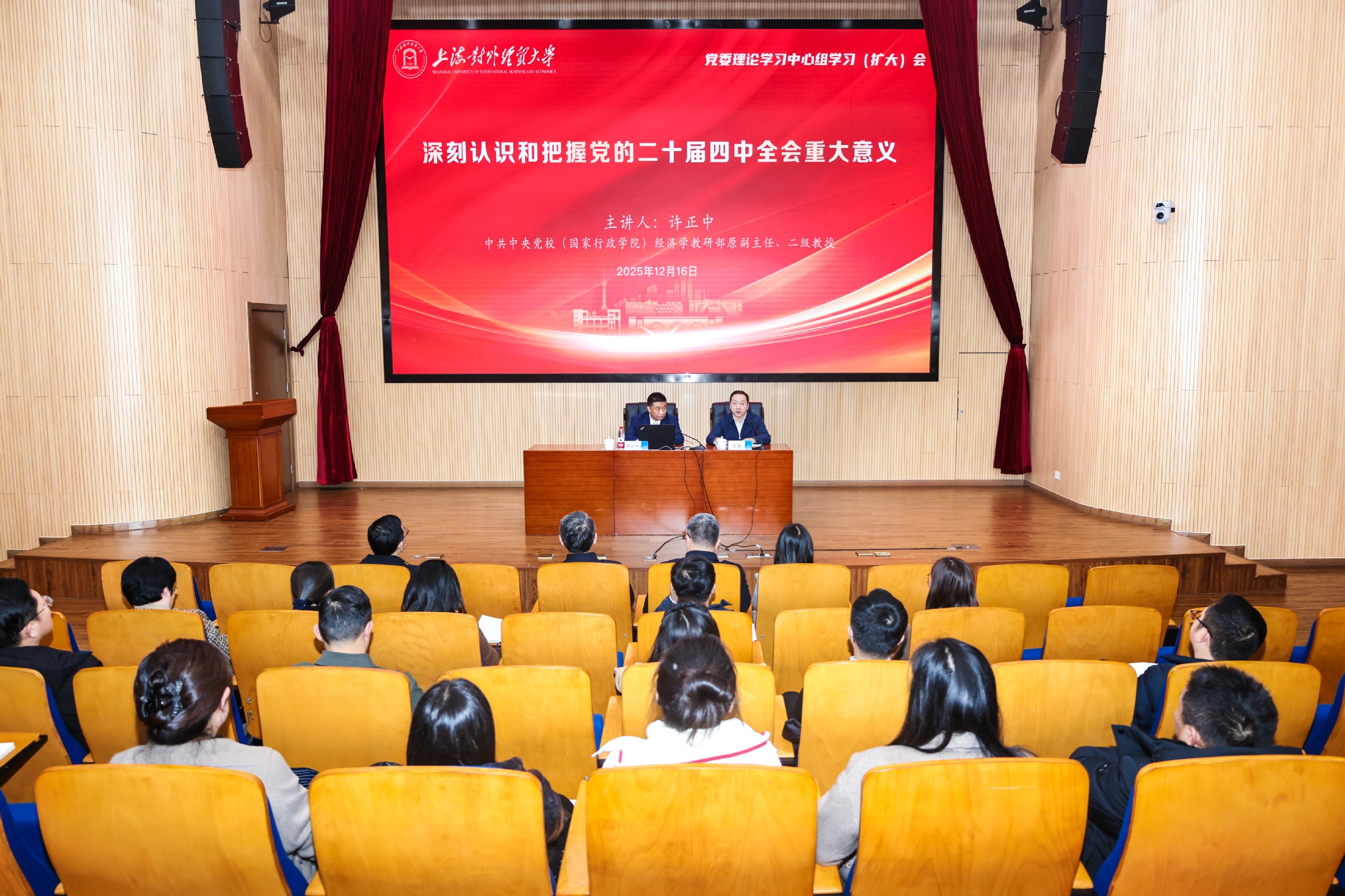 在全校上下深入学习贯彻党的二十届四中全会精神的热潮中,为进一步帮助广大干部教师全面领会和把握全会的重大意义,12月16日下午,学校在松江校区图书馆思源报告厅举行党委理论学习中心组学习(扩大)会,邀请中央党校(国家行政学院)经济学部原副主任许正中教授作主题为“深刻认识和把握党的二十届四中全会重大意义”的专题辅导报告。学校党委理论学习中心组成员、中层领导人员、教工党支部书记、系(专业)主任、各民主党派、统战团体负责人、第九期青年骨干教师培训班学员和机关第二届青年业务骨干培训班学员参加报告会。会议由校党委副书记吴毅主持。