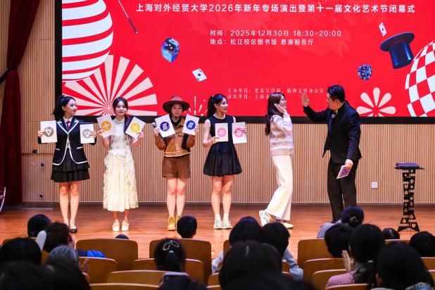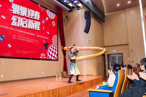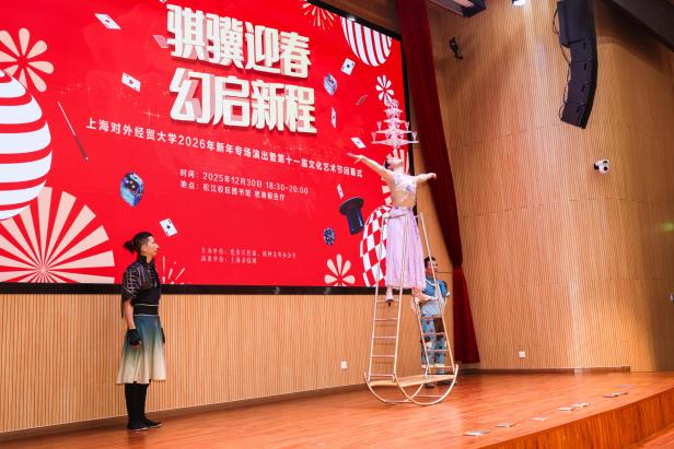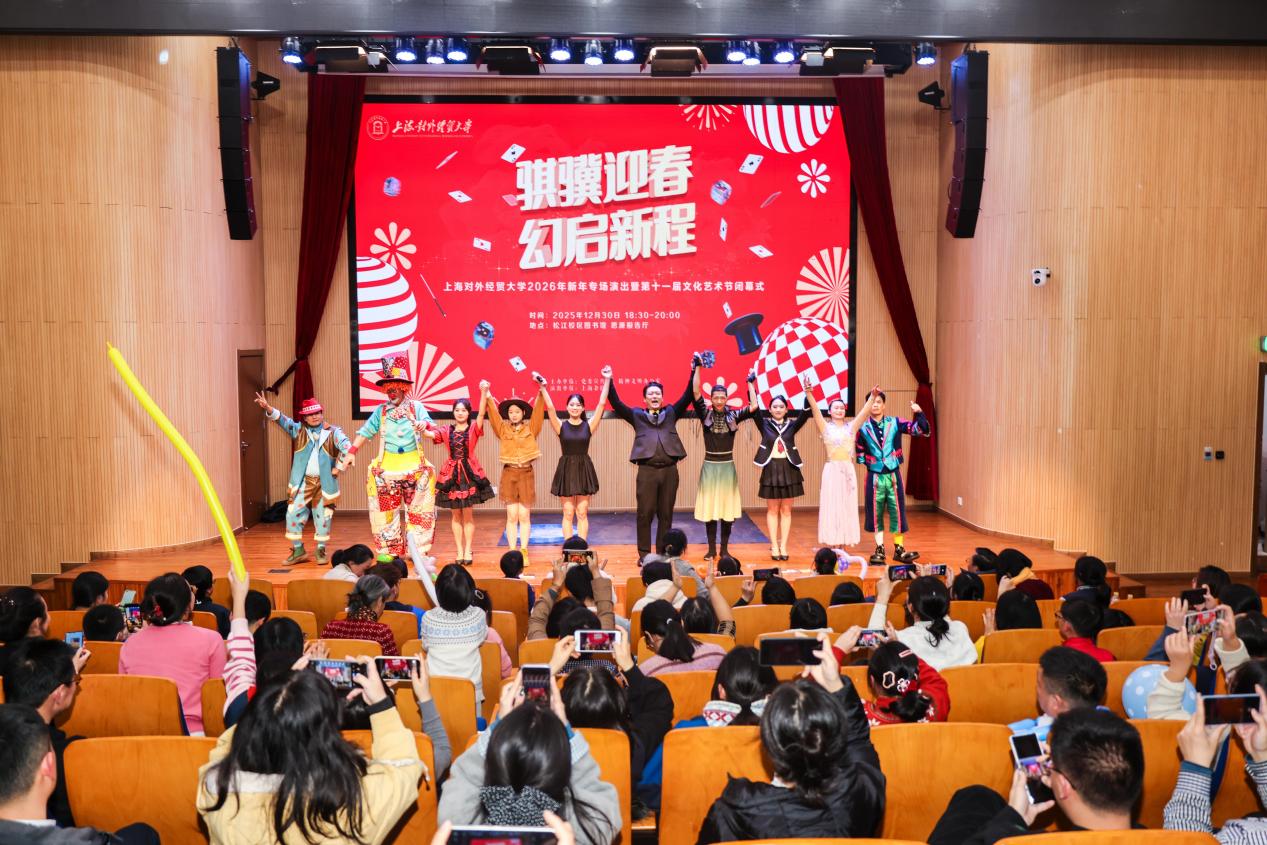 新元肇始,万象更新。12月30日晚,上海对外经贸大学2026年新年专场演出暨第十一届文化艺术节闭幕式在松江校区图书馆思源报告厅举行,活动邀请上海杂技团带来主题为“骐骥迎春,幻启新程”的杂技和魔术专场表演。