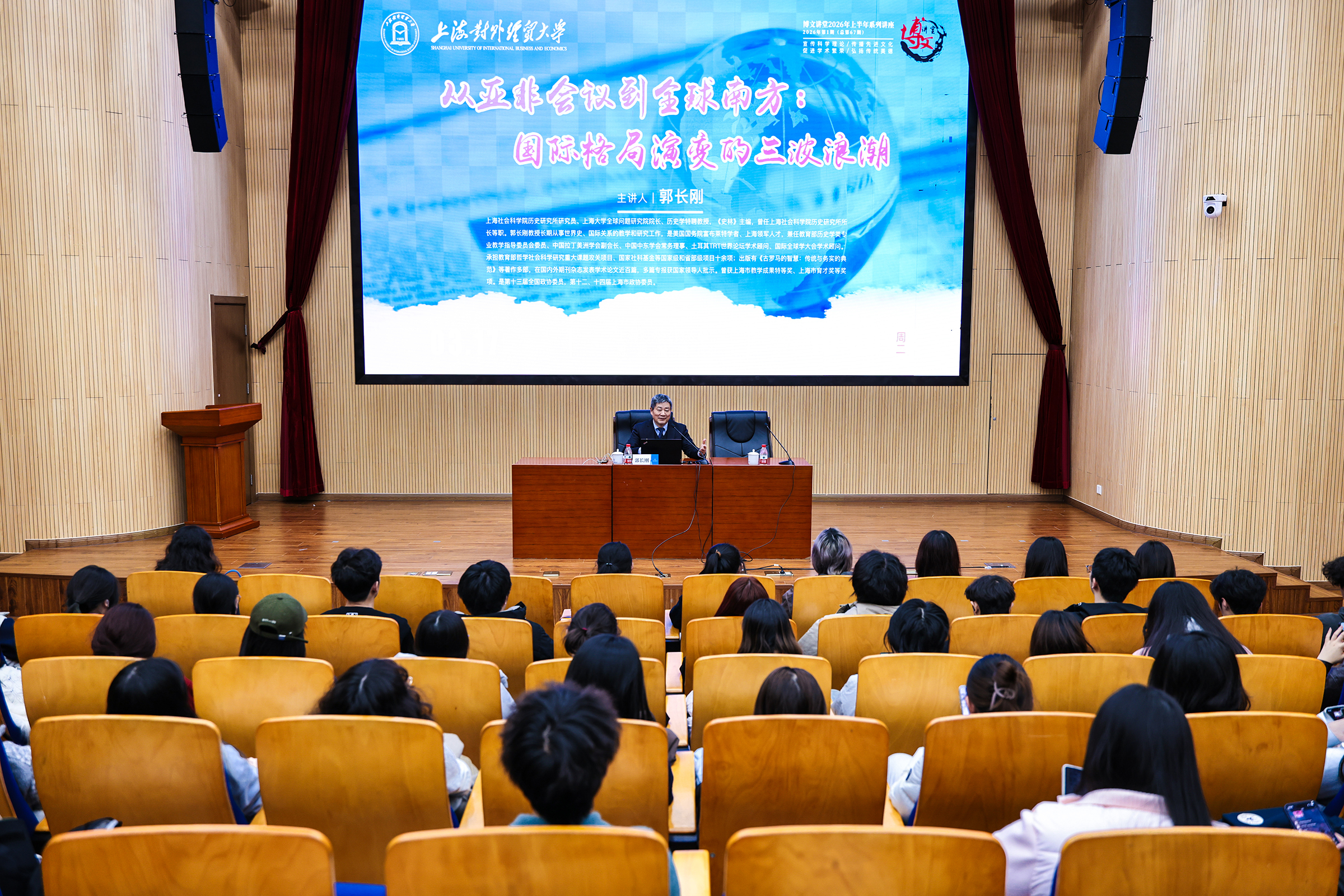 3月17日下午,上海对外经贸大学博文讲堂2026年首场讲座(第67期)在松江校区思源报告厅顺利举行。本次讲座特邀上海社会科学院历史研究所研究员、上海大学全球问题研究院院长、历史学特聘教授郭长刚,作“从亚非会议到全球南方:国际格局演变的三波浪潮”的专题讲座。活动由党委宣传部副部长张帅主持。讲座现场座无虚席,气氛热烈。