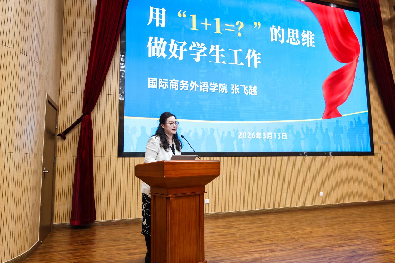 交流发言环节中,统计与数据科学学院党委副书记范鸣、国际组织学院(贸易谈判学院)党委副书记程栋、国际商务外语学院辅导员张飞越分别以《凝心聚力 共筑学风——浅谈加强学风建设的思考与探索》《从“看世界”到“看门道”——以深度实践为例谈国际化人才的浸润式培养》《用“1+1=?”的思维做好学生工作》为题作专题交流。