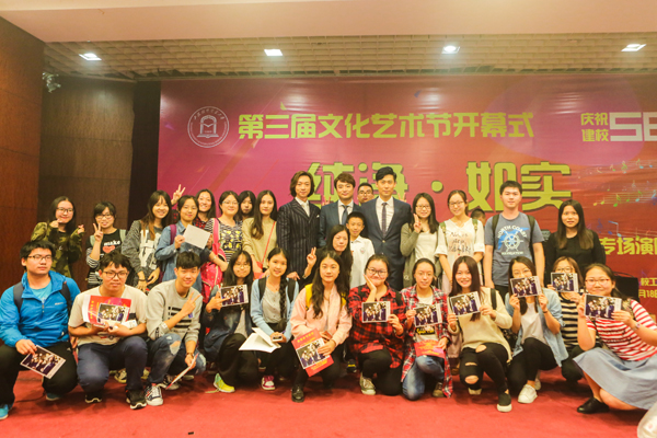 学校特邀上海跨界演唱组合“力量之声”进行“纯净如实”专场演出。“力量之声”组合由毕业于上海音乐学院声乐歌剧系的三位青年歌唱家宋罡、余笛、王志达组成,他们以专业的音乐素养、磅礴的气势和振奋人心的节奏让全场观众直呼过瘾。“力量之声”组合为师生倾情奉献了其代表作《我们的上海》以及多首经典中英文歌曲,他们优美的歌声使现场观众听得如痴如醉。本场演出高潮迭起,在“力量之声”组合特别为纪念长征胜利80周年献唱的歌曲《红旗飘飘》中圆满落幕。