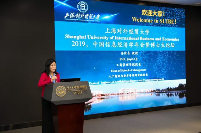 工商管理学院院长、人工智能与变革管理研究院院长齐佳音教授作为2019年中国信息经学会学术年会暨博士生论坛承办方作了发言。她指出,上海对外经贸大学具有“培养具有全球视角的商务人才”的特色,也在探索数字经济环境下转型发展的道路。人工智能与变革管理研究院以中国开源PaaS工业协会和上海市大数据应用研究会为抓手,已经形成了以人工智能、区块链、工业互联网为方向政产学研合作新模式。
