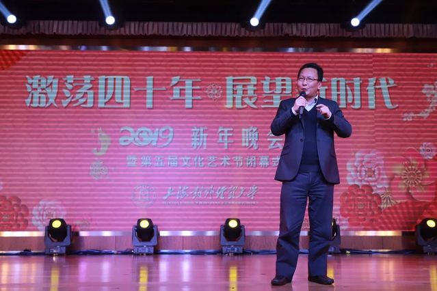 四十年改革开放,沧海云帆,梦圆东方;改革开放四十年,壮丽航程,万千气象。在2018即将接近尾声的日子里,师生欢聚一堂,庆祝改革开放四十周年,迎接新年的到来。12月27日晚,主题为“激荡四十年·展望新时代”的2019年新年晚会暨第五届文化艺术节闭幕式在信息楼507报告厅隆重举行。本次晚会由学校主办,党委宣传部、校文明办、校工会、校团委承办,党委办公室、校长办公室、党委教师工作部和老干部办公室协办。校领导朱国宏、许玫、祁明、陈洁、徐永林和附校校长陈伟平出席晚会现场,各单位部门负责人、各学院党委(党总支)书记、院长、学校优秀教师代表、优秀学生代表和近500名师生观看了本次晚会。