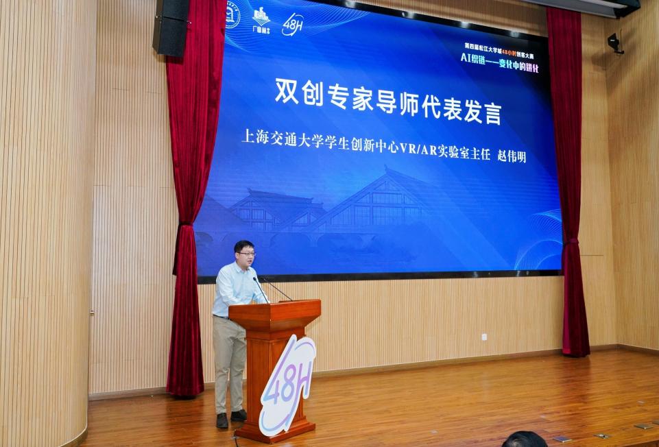 沈艺在致辞中表示,学校围绕国家战略和区域需求,秉持“为科服务、为产育人”和“重服务、强贡献”的理念导向,以“人才培养-特色优势-战略对接-需求适配”为逻辑,重点服务面向国际经济与贸易、国际金融、数字经济三大领域,打造“科创+开放”双引擎,提升企业出海人才供给,支撑创新创业提质升级。本届大赛聚焦“AI + 产业融合”,正是深化校地合作、共育新质生产力、助力打造松江大学城科创源的重要平台。她强调要以赛为媒,深化校地协同,共筑创新生态,聚焦AI,赋能学科交叉,彰显办学特色,聚力双创,激发创新活力,践行育人使命。她希望参赛学生勇于突破、注重协作、脚踏实地、坚守初心,在48小时极限挑战中挥洒才华,收获成长。