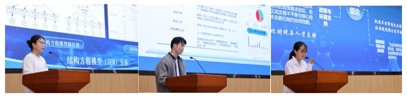 会上还进行了调研队伍成果展示。统计与数据科学学院本科生王晨、研究生江宇豪,国际经贸学院本科生周禹璇分别以《新质生产力视角下低空经济高质量发展路径研究——基于长三角地区的实证调研》《科技创新型企业新质生产力影响因素与路径机制研究》《科技创新驱动新质生产力:长三角企业空间异质性、障碍识别与品牌-数字化赋能路径》为主题,就调研过程、分析工具、研究结论、政策等进行了成果汇报。