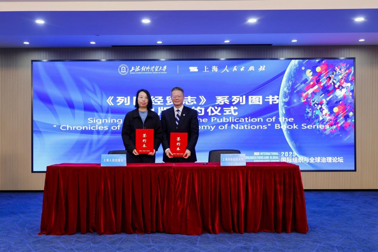 在论坛上,上海对外经贸大学还推出了《列国经贸志》丛书编纂计划。《列国经贸志》系列丛书主编、上海对外经贸大学教授章益国与上海人民出版社副总编辑钱敏共同签署了《列国经贸志》系列图书出版合同。此次签约不仅标志着《列国经贸志》系列图书从学术研究正式迈向出版落地,更意味着我校在区域国别研究与国际经贸学术成果转化上迈出关键一步。未来将推动中国自主经贸知识体系进一步完善,为政府决策、企业出海、人才培养提供更坚实的智力支撑,为服务国家高水平对外开放、助力上海国际贸易中心建设注入新动能。