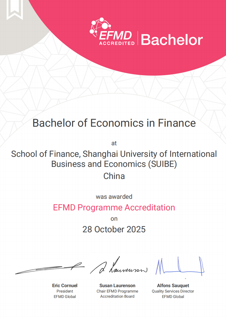 近日,我校金融管理学院金融学专业本科项目正式通过欧洲管理发展基金会(EFMD)国际认证,首期认证期为三年。EFMD认证是全球管理教育领域最具影响力的权威认证之一,以评估严谨、体系全面著称,是国际商科教育卓越品质的重要标志。获得该认证标志着我校金融教育质量达到国际公认一流标准,确立了我校金融教育在国际领域的领先地位。