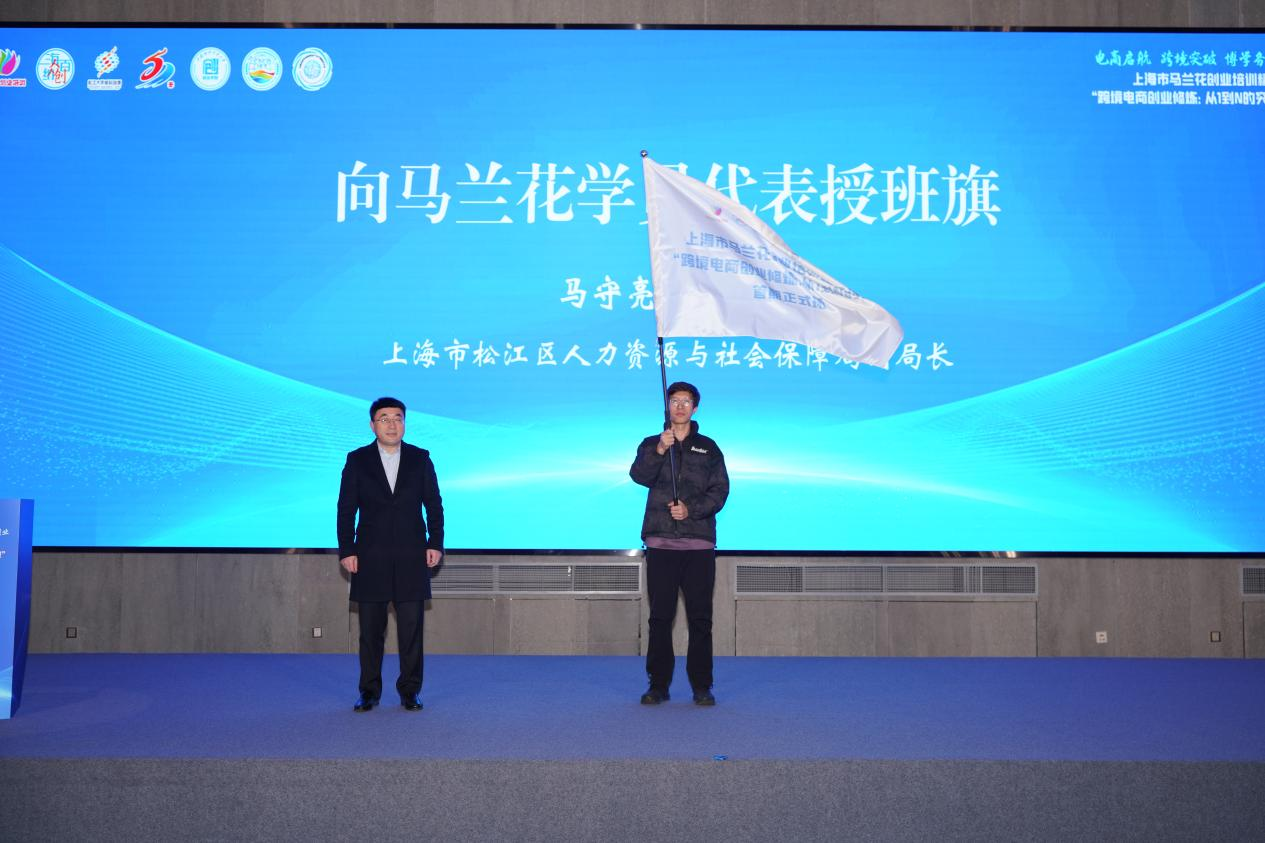 在仪式最后,松江区人力资源和社会保障局副局长马守亮向马兰花创业培训学员代表郑重授予班旗,标志着“跨境电商创业修炼:从1到N的突破”首期正式班启航。授旗仪式既象征着责任与使命的传递,也寄托着对学员们勇于创新、敢于实践的殷切期望,激励大家以饱满的热情投入学习与实战,在跨境电商赛道上携手前行、不断突破,开启创业成长的新征程。
