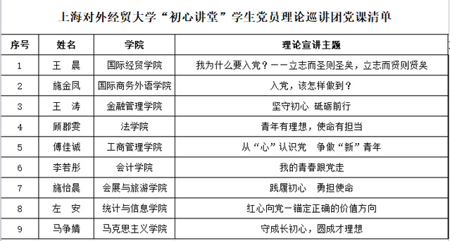 一次党课巡讲:学工部从各学院优秀学生党员中选拔理论基础扎实、综合素质强、宣讲水平高的党员先锋代表,成立“初心讲堂”学生党员理论巡讲团,巡讲团深入各学院学生党支部、团支部、学生社区党建中心开展党课巡讲活动,学生党员从自身出发,发挥朋辈作用,面向新生进行入党启蒙和导航。学生党员理论巡讲团成员分组集体备课,马克思主义学院教师指导,确保党课质量,契合学生需求,提供菜单式党课清单,制定党课目录,接受学院学生团组织和班级等预约,做到一学院一巡讲。“初心讲堂”学生党员理论巡讲团已经深入各学院新生班级、团支部和社区红色课堂开展党课巡讲。