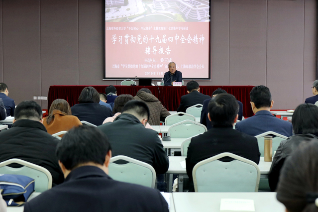 为扎实推进学校“不忘初心、牢记使命”主题教育,深入学习宣传贯彻党的十九届四中全会精神,1128日下午,学校“不忘初心、牢记使命”主题教育第十七次集中学习在图文信息大楼526会议室举行,上海市“学习贯彻党的十九届四中全会精神”宣讲团成员、中国政治学会副会长、上海市政治学会会长、复旦大学博士生导师桑玉成教授应邀作党的十九届四中全会精神学习的专题辅导报告。学校领导班子成员、全体中层干部、系(专业)主任、师生代表参加报告会。报告会由校党委副书记吴毅主持。