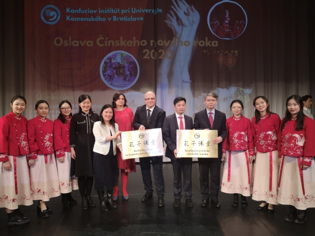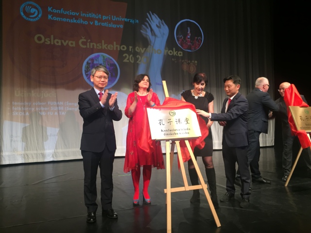 在访问斯洛伐克考门斯基大学期间,代表团出席了考门斯基大学孔子学院下设孔子课堂揭牌仪式及孔子学院2020春节招待会。参加此次揭牌仪式的有中华人民共和国驻斯洛伐克大使馆临时代办王霁、考门斯基大学孔子学院中方院长叶蓉、斯方院长贝雅娜(Jana Benicka)以及斯洛伐克政界、商界和学界人士、华人华侨代表共计400余人。祁明代表学校致辞,他表示上海对外经贸大学将继续大力支持孔子学院及下设孔子课堂的发展,为促进校际合作、增进中斯友谊做出更大贡献。