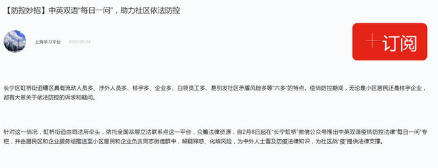 除了在媒体上发表学术文章,我校专家以实际行动为社区防疫贡献智慧力量也受到媒体关注,“学习强国”报道我校法学院师生参与社区防疫法律宣传翻译和咨询工作。长宁虹桥街道邀请法学院李磊老师担任专家,将该所编制的抗疫宣传材料——“每日一问”翻译成中英文双语宣传单,向街道内外籍人士分发,以促进抗疫工作。目前,李磊和董岭晓翻译的宣传资料已在“长宁虹桥”微信公众号上连载了13期,小区出入管理规定、如何配合社区开展工作以及合同解除、工资计算等问题都用双语进行了专业的解答。
