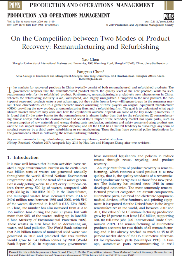2019年12月,工商管理学院陈瑶副教授作为第一作者与上海交通大学陈方若教授合作的论文《On the competition between two modes of product recovery: remanufacturing and refurbishing》在管理科学领域国际顶级期刊《Production and Operations Management》正式发表。该期刊为UT-Dallas 24本商学顶级期刊之一,也是Financial Times 50本商学院顶级期刊之一。
