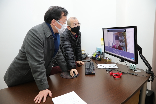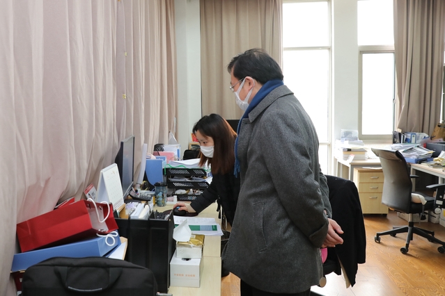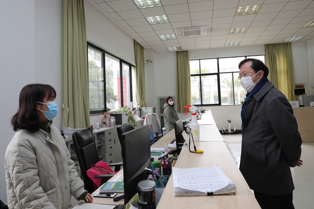 观摩课程在线教学,汪荣明详细听取学校在线教学整体工作情况汇报慰问在线教学提供服务保障的一线工作人员。