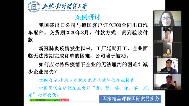 3月3日上午,在《国际贸易实务》和《不动产评估》课程在线教学的直播间里,来了一位特别的观众,校长汪荣明进入在线直播间,与身在全国各地的贸大学子相聚云课堂,共听一堂课。《国际贸易实务》课程作为在线开放课程已在中国大学MOOC平台开课4期,主讲教师沈克华每期直播授课4-6次,在线教学经验丰富今天的教学以新冠疫情对国际贸易的影响开题,互动研讨外贸企业的应对措施和解决方案,并引导学生强化国际经贸人才应有的责任与担当。讲授《不动产评估》课程的唐旭君老师首次开设在线直播但毫不怯场,娴熟的教学内容,娓娓道来的讲授让好久未见的同学们倍感亲切,结合专业特色用视频、图片展示的毕业生成长经历,使学生加强资产评估从业者的社会责任感和职业操守认知,精心设计的教学活动中不时穿插随堂调查、互动讨论,让感受面对面的教学氛围,就像回到学校和老师身边一般自然。