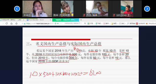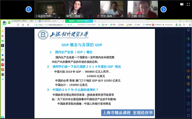 3月2日,国际经贸学院陆文安老师早早打开电脑,开启Zoom视频系统,测试耳麦,检查PPT课件、教学视频的播放情况,一切就序,在课程微信群里给世界各地的同学们发出了准备上课的友情提醒。“老师,如果现在我去买入人民币,您觉得怎么样?”身在乌兹别克斯坦的GOYIBOV(李友)同学先一步登入课堂直播间,开门见山地向陆老师他关的汇率问题。“老师,我这里是早上3点钟,我可是设置了手机提醒来上课”,远在挪威的FREDRIK BERTEUS(福气)同学向老师和同学们打着招呼。待37名留学生聚齐《宏观经济学》课程“云端课堂”,陆老师以“新冠肺炎疫情对全球经济形势的影响”为题开始了新学期留学生课程直播第一课。