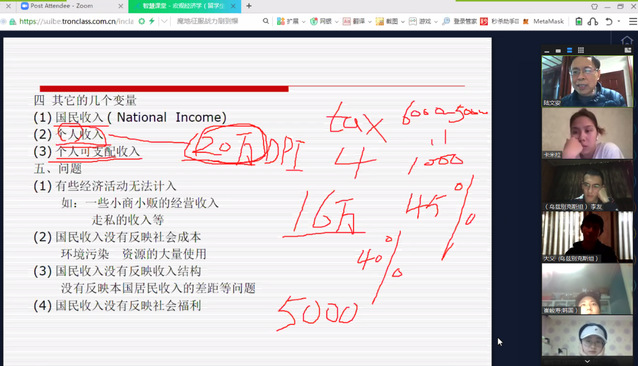 《宏观经济学》是西方经济学的重要组成部分,其中许多知识和经济理论与当今经济社会发展有着密不可分的联系。针对留学生来自不同国家,学习能力存在差异,陆文安老师适当调整教学难度和进度,更加注重结合实际问题,引导同学们学会用理论知识分析自己身边的社会经济问题。讲到国内生产总值(GDP)时,他会让留学生了解并介绍所在国家经济情况,让学生对GDP有更直接的认识。在比较国内生产总值(GDP)和国民生产总值(GNP)时,他会让留学生讨论,本国人在国外获得的收入应该计入本国还是国外GDP?每一个问题的提出都会引起学生的兴趣,在云课堂上展开热烈讨论。
