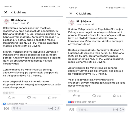 212日和14日,在获悉国内武汉等地急需防护物资消息后卢大孔院积极响应斯洛文尼亚政府号召,通过孔院社交媒体发布为中国捐赠口罩的通知,组织防护物质捐助,孔院部分教师也参与了声援祖国抗疫的视屏录制,与祖国同心抗疫。在做好自身工作的同时,卢大孔院还为阻击当地疫情做出贡献,组织和指导我校赴斯洛文尼亚交换学生自我隔离,帮助其联系斯洛文尼亚驻中国使馆,协助在斯华人华侨对斯捐赠防疫采购物资等。