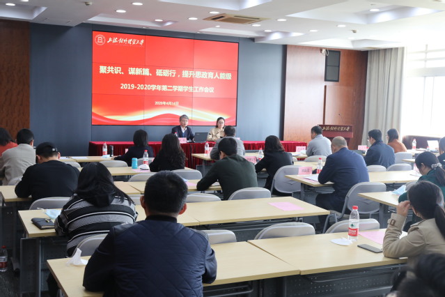 4月14日上午,主题为“聚共识、谋新篇、砥砺行,提升思政育人能级”的2019-2020学年第二学期学生工作会议在信息楼503会议室召开。校党委副书记、副校长祁明出席,学工系统全体成员通过现场会和视频直播两种方式参加会议。会议由校党委学(研)工部部长许继亮主持。