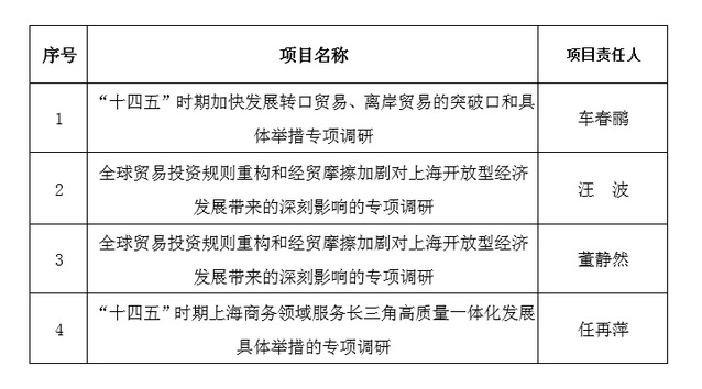 近日,2020年度上海市商务委员会商务专项调研招标结果公布,确定15个项目组中标,其中我校4个项目获得立项,每个项目资助15万元。