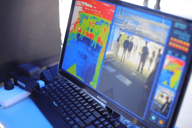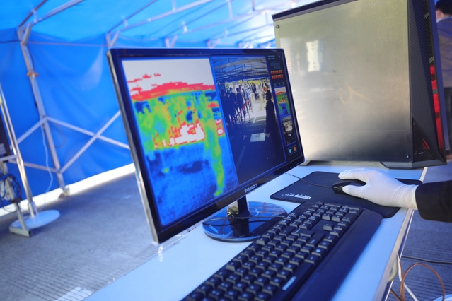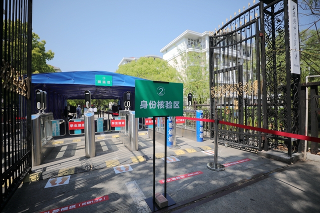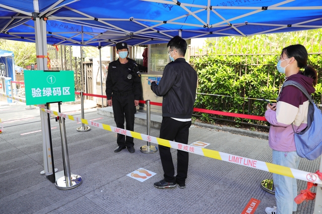学校学生社区东门口右侧设置隔离通道,地上粘贴间距标识,学生须佩戴口罩间隔1.5米有序排队,依次进行健康绿码检查,通过人脸识别或者刷校园卡进行身份验证,进入测温区检测体温、接受行李消毒。这是模拟返校学生的演练人员进入学生社区需要过的第一道“关卡”。